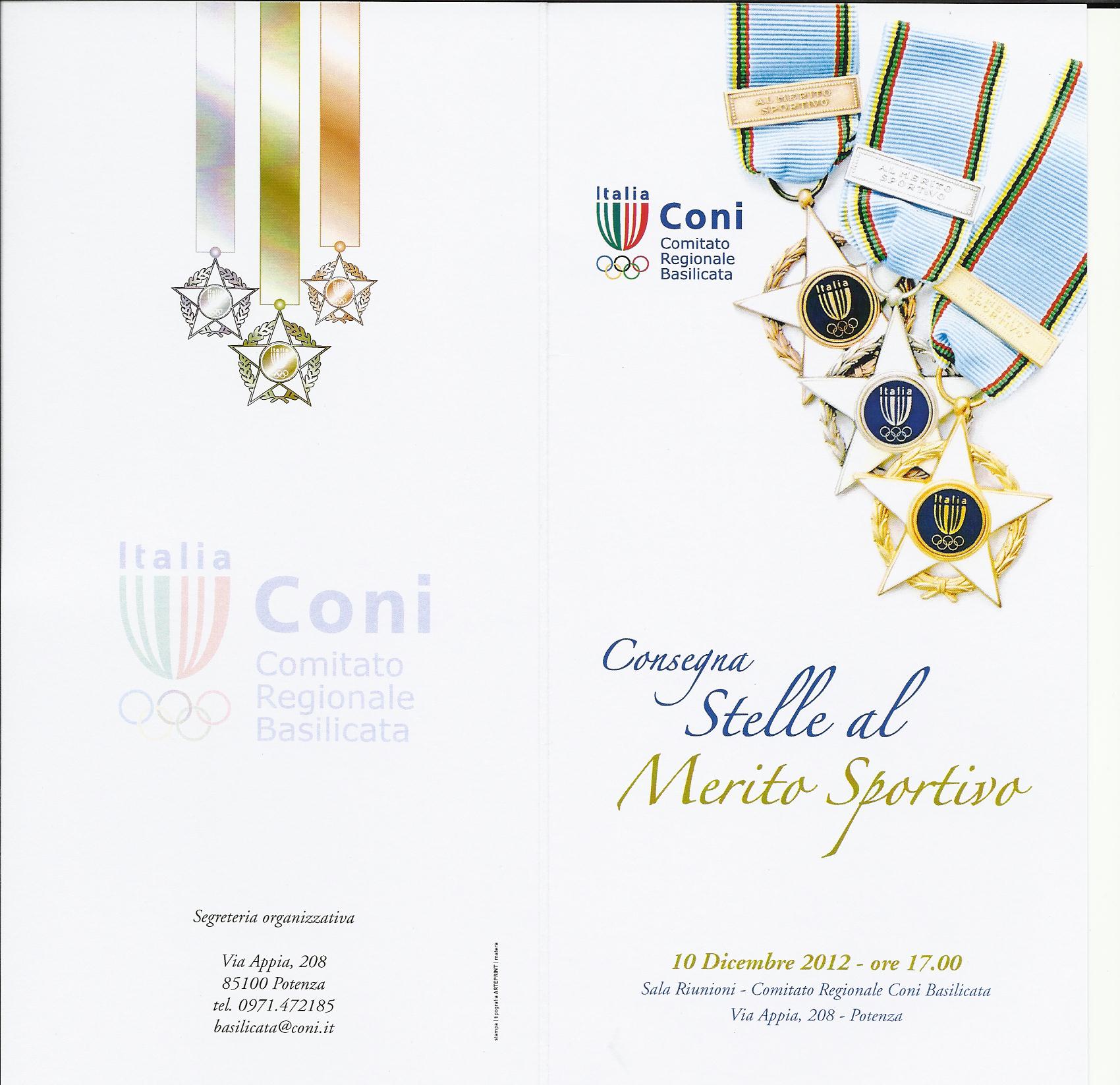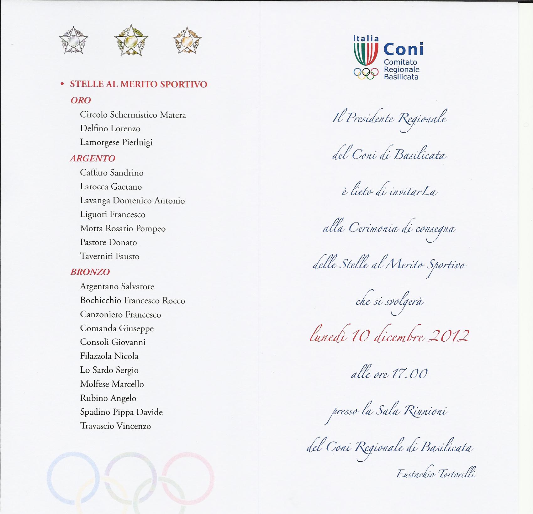 Il Presidente Regionale del CONI di Basilicata è lieto di invitarLa alla Cerimonia di consegna delle Stelle al Merito Sportivo che si svolgerà lunedì 10 Dicembre 2012 alle ore 17:00 presso la sala riunuioni del Comitato Regionale CONi di Basilicata, via Appia 208 - Potenza.
